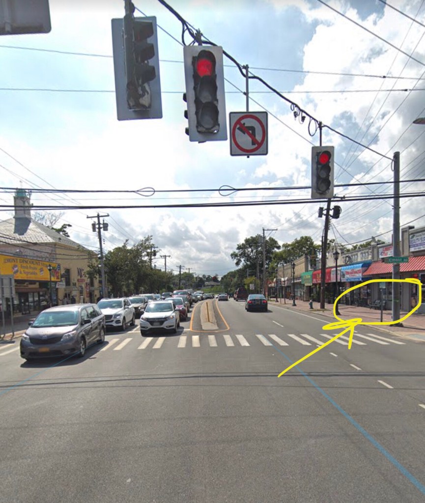 I walk to the northwest corner of Hempstead Turnpike and Elmont Road and sit on a green wrought iron bench, two storefronts down from the salon. I’m on the border of Queens County and Nassau County in Long Island. In Queens, the street is Hempstead Avenue. In Nassau, it is Hempstead Turnpike.
