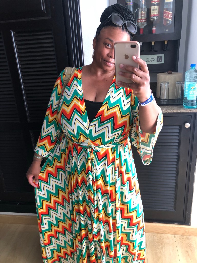 The maxi dress with billowy sleeves was all her – made in jersey material, it would be comfortable while also being able to flow and twirl with her movements. The colors were vibrant — bright tangerine, jade green and black zigzags set on a white background, a deep v neckline to accentuate her décolletage and best of all, pockets.