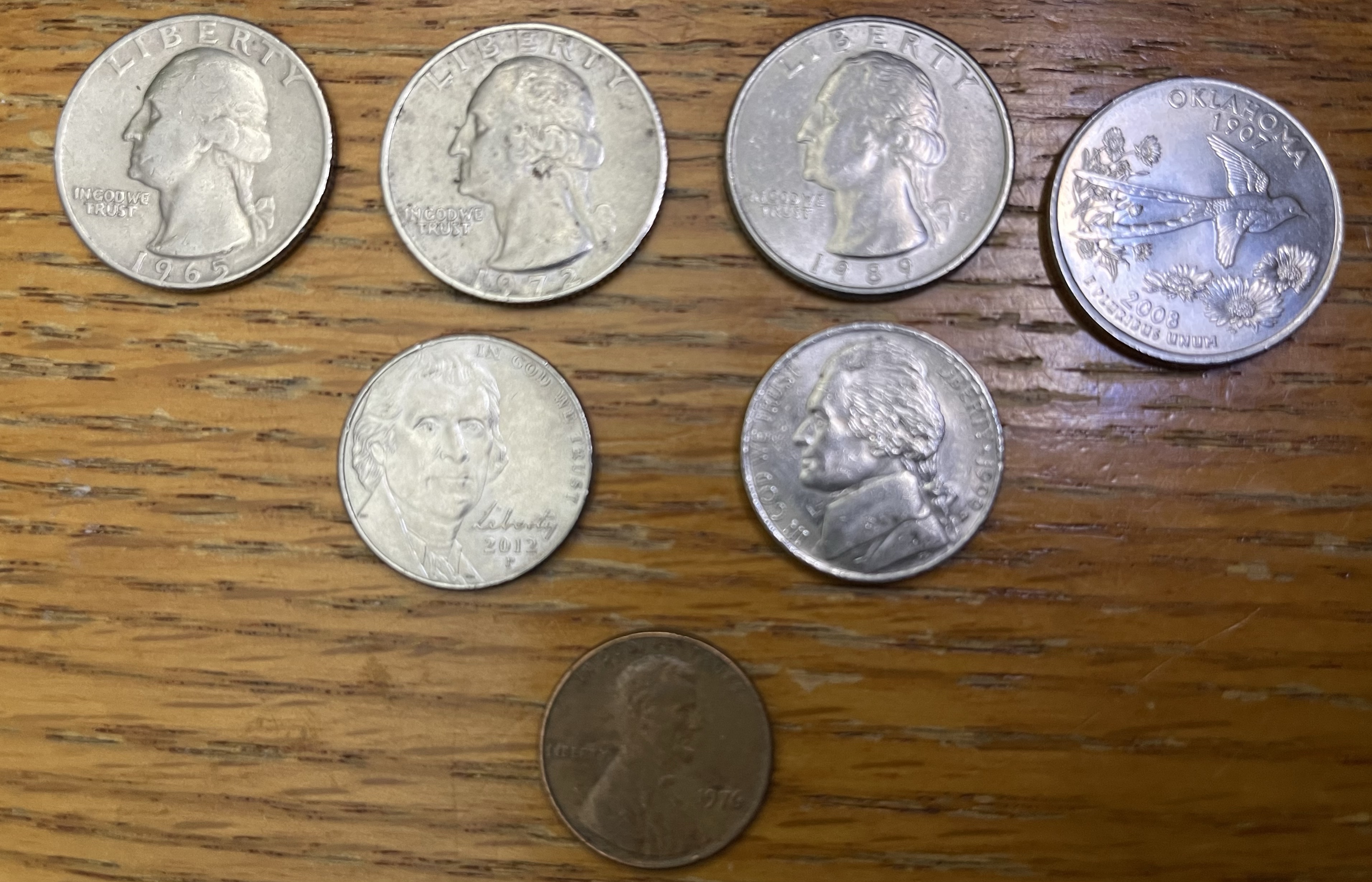 The oldest in my possession was a 1965 quarter (oh, the places this has been in 56 years!), which made me look up what gas cost in 1965 ($0.31) and then its current value (if in mint condition, could be worth between $1 – $35). I also found a 1972 quarter (#JourneyToL), a 1989 quarter (year I started college), lots of quarters from 1991 and dimes from 2021. The prettiest one, was a 2008 Oklahoma quarter, which, features the Scissor Flycatcher bird and the Firewheel wildflower. I learned more, but I’m gonna stop here, lest you think me a nerd.