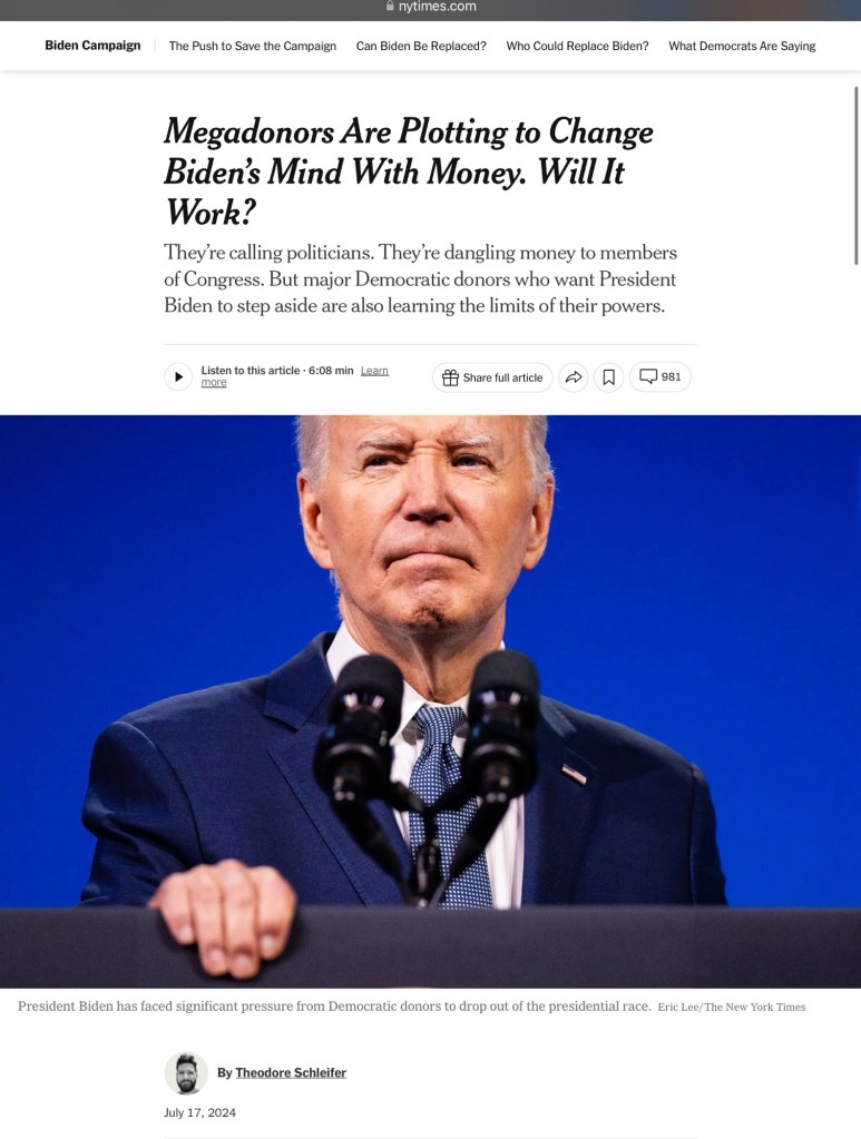 I’m frustrated with him, for not taking the Lyndon Johnson route a year ago, and preventing us from being in this position now. We are suffering the consequences of Ruth Bader Ginsburg not resigning when Obama asked her to. He’s not a King and we don’t owe him anything, but he and his team owes us everything. They work for us! If certain leaks are to be believed, he’s giving Effie White “and I am telling you I’m not going” ego.